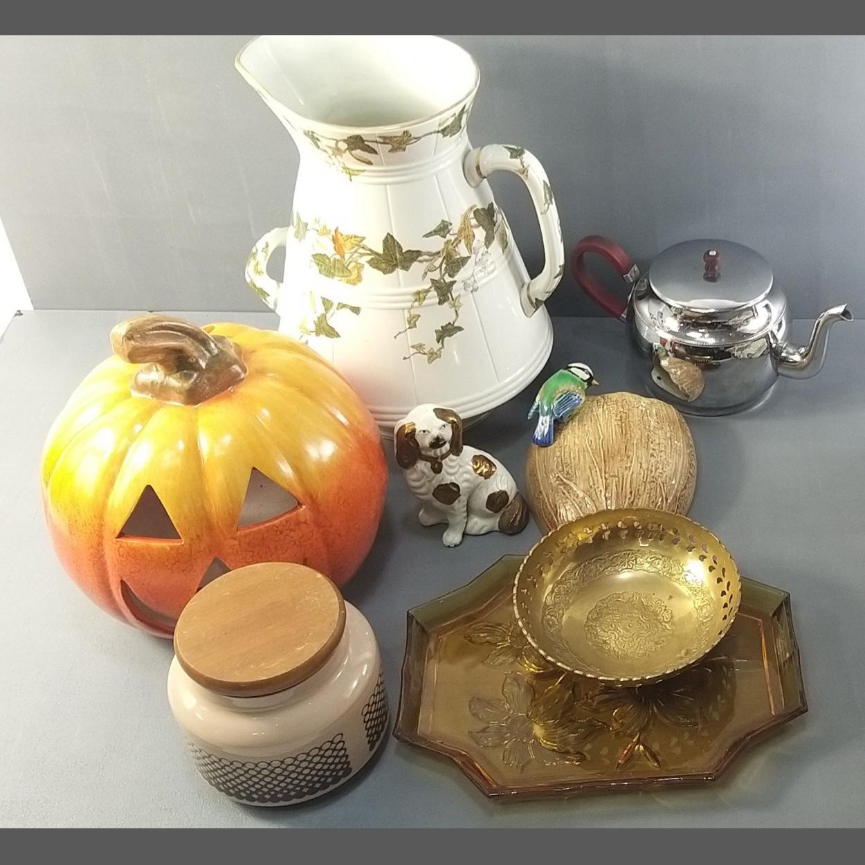 A mixed lot. A large ceramic pumpkin, a pretty modern water ewer and others.