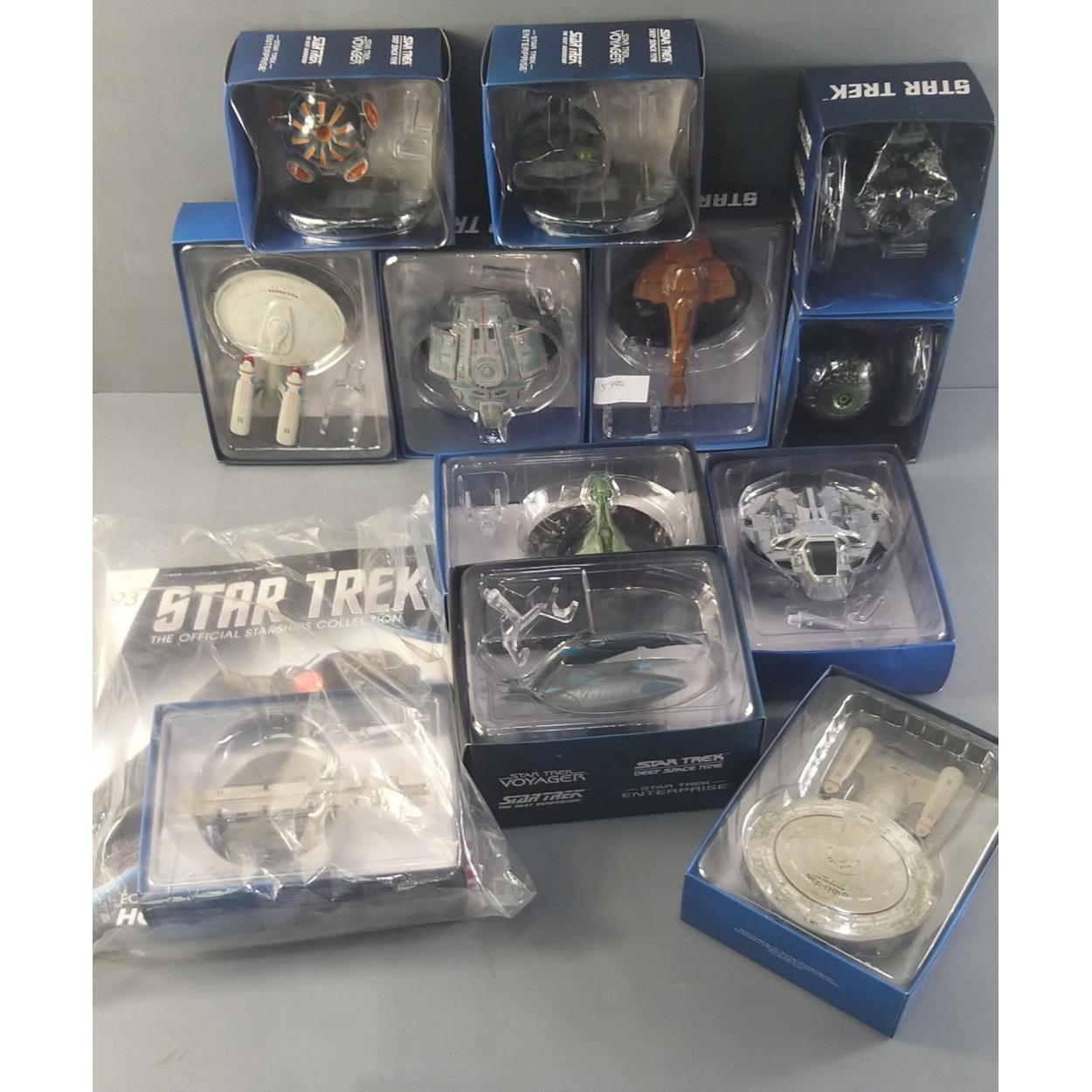 Eaglemoss STAR TREK models to include BORG QUEEN'S SHIP (8178-A/A), EYMORG ION DRIVE SHIP (4107-A/A), ORION SHIP (1846-A/A), BORG SPHERE (4747-A/A), KLINGON BIRD-OF-PREY (5339-A/A), B'OMAR PATROL SHIP (5102-A/A), NIAGRA CLASS (6144-A/A), GALOR CLASS (0783-A/A), USS DEFIANT NX-74205 (7177-A/B), XINDI INSECTOID VESSEL (3081-A/K), USS ENTERPRISE NCC-1701-D (8332-A/E), and one other complete with Star Trek : The Official Starships Collection, Issue 93. All in good condition in original boxes and Perspex protection. Eleven pieces in total.