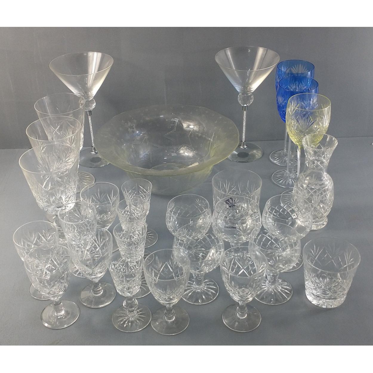 TOP QUALITY! A mixed glassware lot to include crystal table lamp, a selection of drinking vessels, vases, trinket dishes, etc