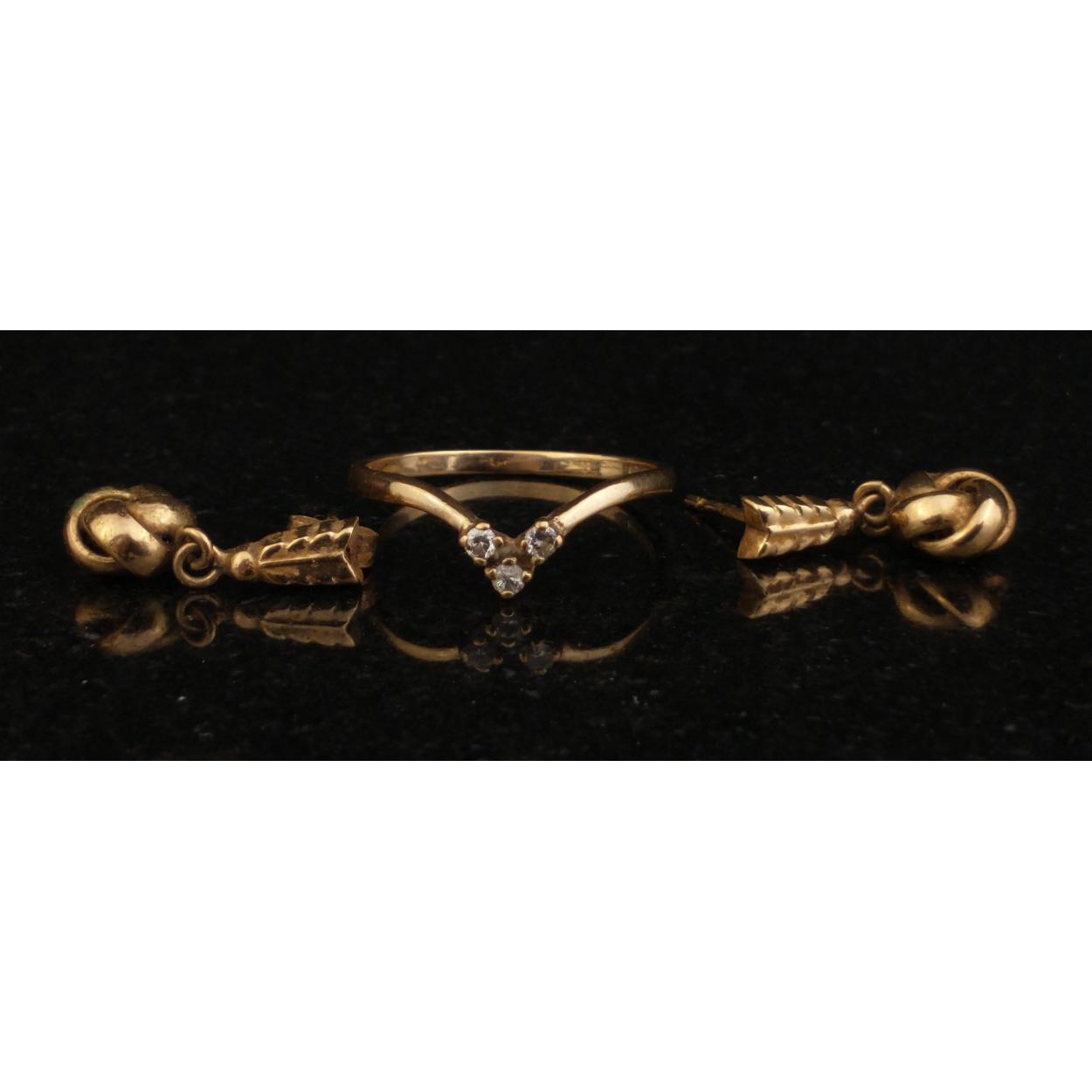 Earrings 375 hallmarked and a 9ct gold wishbone ring with three small stones. Gross weight 2.6g approx.