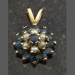 A small hallmarked 375 stamped pendant set with a central blue stone, 6 seed pearls and 12 blue stones,10mm long approx. Gross weight 1.36g approx