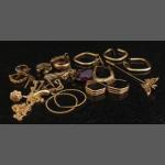 A PIRATES HOARD! A quantity of stamped 9ct / 375 jewellery pieces such as earrings, chain etc. Total weight 20.2g approx Plus a 375 stamped fob with large amethyst coloured glass stone, gross weight 4.4g approx