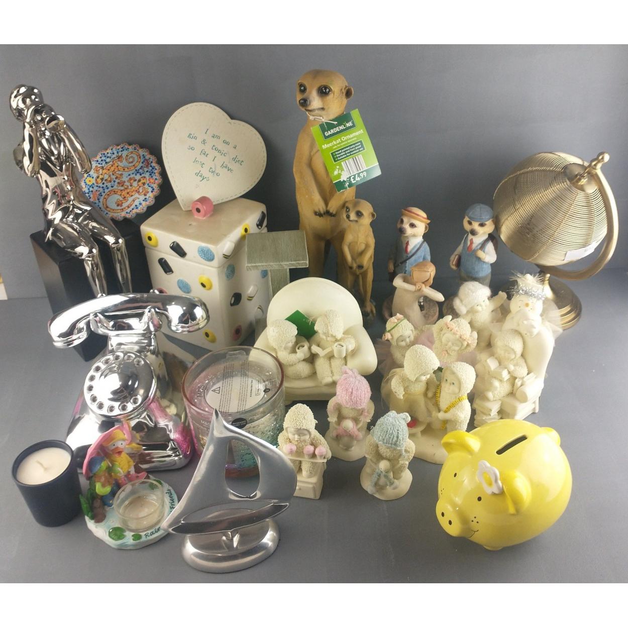 A mixed lot of decorative items to include meerkat ornaments, snowbabies ornaments, liquorice all sorts storage jar etc