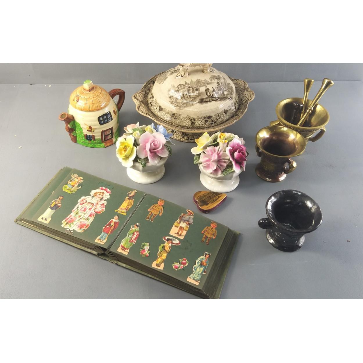 Mixed lot. Comprising china posy vases, brass mortar and pestles, jam pot, Victorian covered dish, MAUCHLINE ware pin cushion