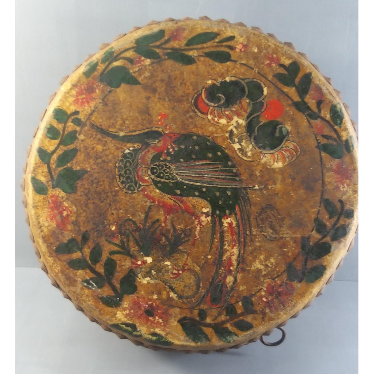 A CHINESE style vintage leather RAWHIDE drum decorated with painted birds / Phoenix 36cm diameter, 22cm depth approx