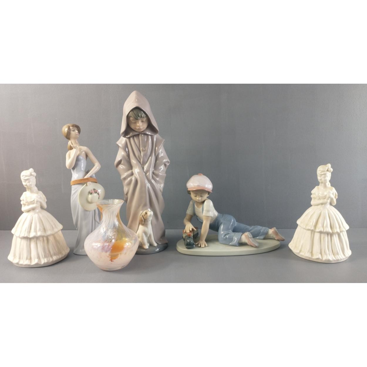 A super NAO / LLADRO collection of three stylish figures. Boy in robe with puppy 25cm tall and two others. Also a small Caithness posy vase and two plain white figures.