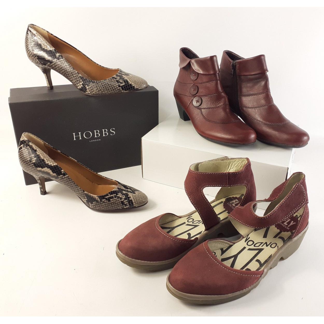 A new pair of HOBBS snakeskin style court shoes size 39, a pair of unworn RIEKER plum coloured ankle boots size 38 and a pair of slightly worn ankle strap shoes, size 38, by LONDON FLY