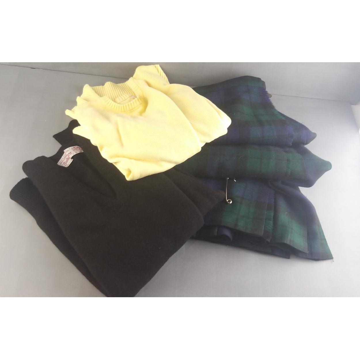 A ladies Black Watch kilted skirt size 20 made by Jedburgh Kiltmakers, a BALLANTYNE 40" Geelong wool black V-neck jumper, and a yellow crew neck mercerised cotton jumper chest 40".