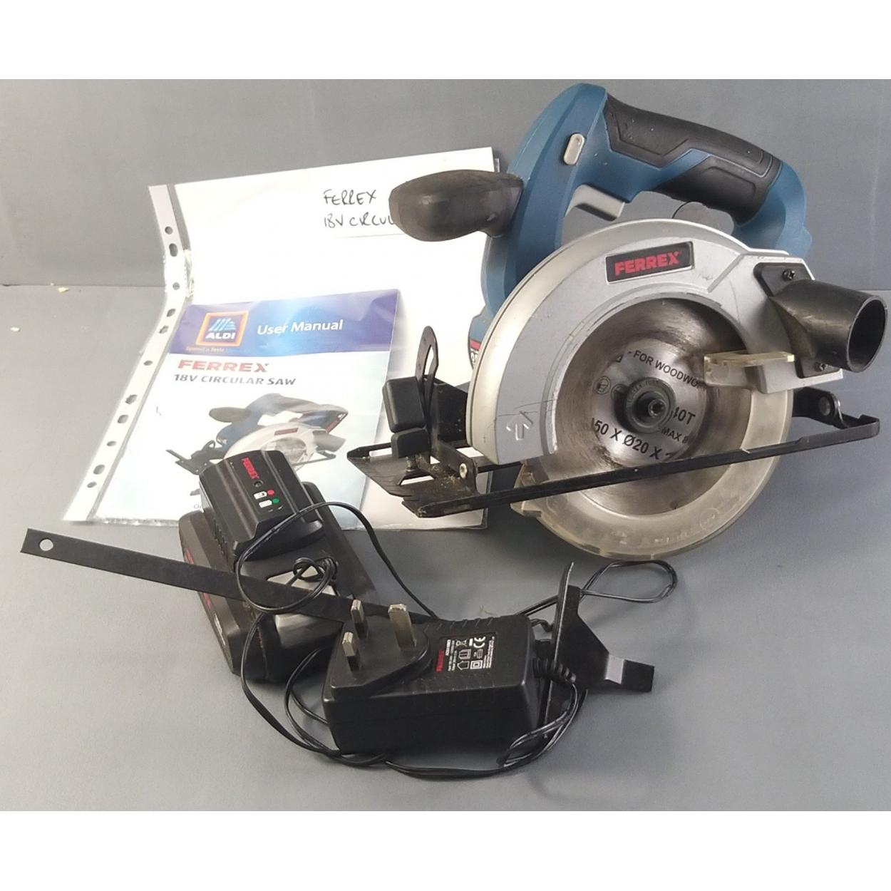 A FERREX CSC150GW hand held circular saw with battery, charger and booklet