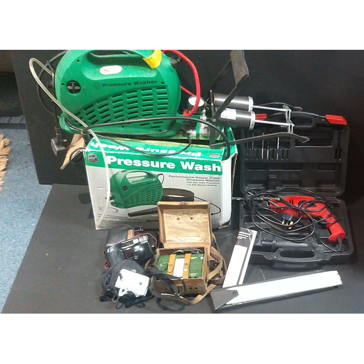A collection of tools to include a foot pump, an Xtreme drill (230v), and a performance power pressure washer,