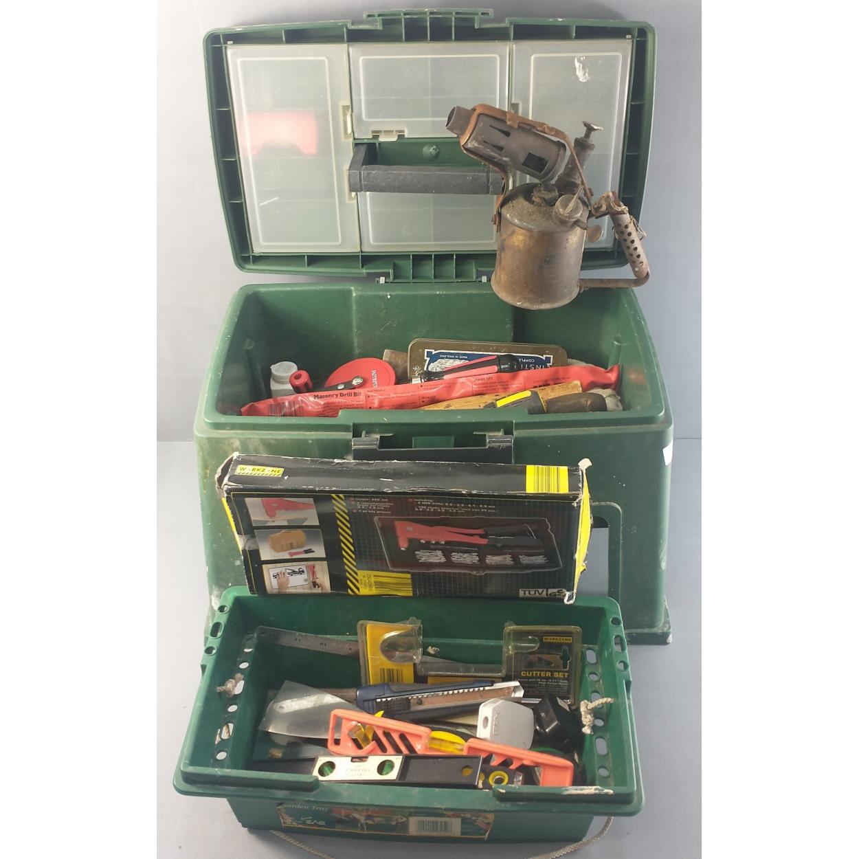 A toolbox footstool stuffed full of tools including hammers, screwdrivers, fixtures, fittings, with a tool tray with vintage blow torch and others.