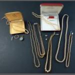 A small fabric covered jewellery box with contents of costume jewellery. Box measures 21 x 16 x 8cm approx