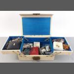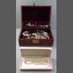 A leather covered jewellery box with canti-levered interior plus contents of many strings of beads including a boxed JANET REGER string of artificial pearls. Box measures 25 x 18 x 9cm approx