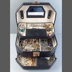 A large selection of mainly costume jewellery, the odd bit of silver and unmarked yellow metal jewellery etc - all in a cantilever style vintage jewellery box - FULL!