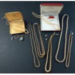 A small fabric covered jewellery box with contents of costume jewellery. Box measures 21 x 16 x 8cm approx