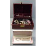 A leather covered jewellery box with canti-levered interior plus contents of many strings of beads including a boxed JANET REGER string of artificial pearls. Box measures 25 x 18 x 9cm approx