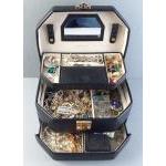 A nice quality ROWALLAN jewellery box with 3 levels (27 x 20 x 16cm approx). Comes with contents of costume jewellery including necklaces, brooches, rings, a marcasite necklace and much else
