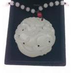 A necklace with jade pendant (50mm dia, 10mm deep) with an Oriental dragon on a chain of beads approx 38cm ago.