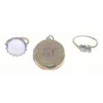 A pendant stamped 9ct back & front, a ring 18ct plated, and an unmarked ring with a purple stone