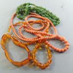 An alternating string of green beads 60cm approx, plus a graduated string of coral beads 80cm approx , and one other set of necklace and bracelet