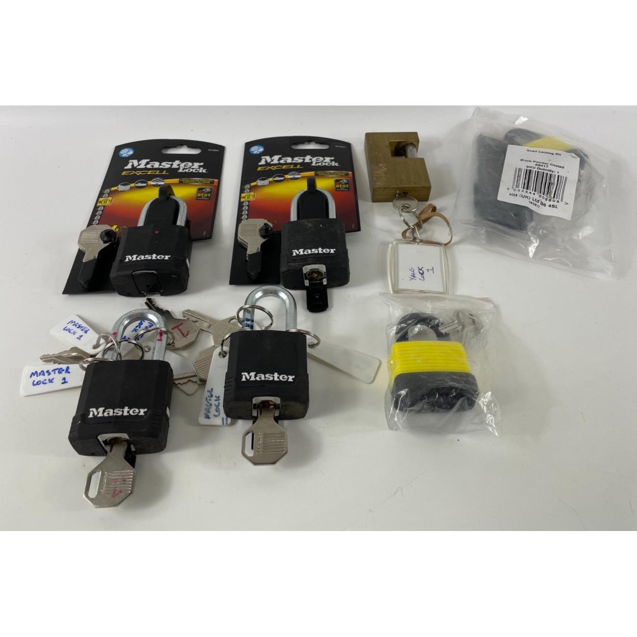 A collection of 7 ROBUST padlocks with keys, some as new unused still in original packaging(MASTERLOCK EXCELL BRANDED)