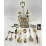 A mixed metalware lot to include an ENESCO picture frame 6x4.5cm, a 4 piece vintage condiment cruet set, a lidded trinket box with red velvet lining 11x7x5cm, a selection of jam spoons, some EPNS, a collector's spoon from Gibraltar stamped silver (gross weight 31g)