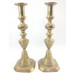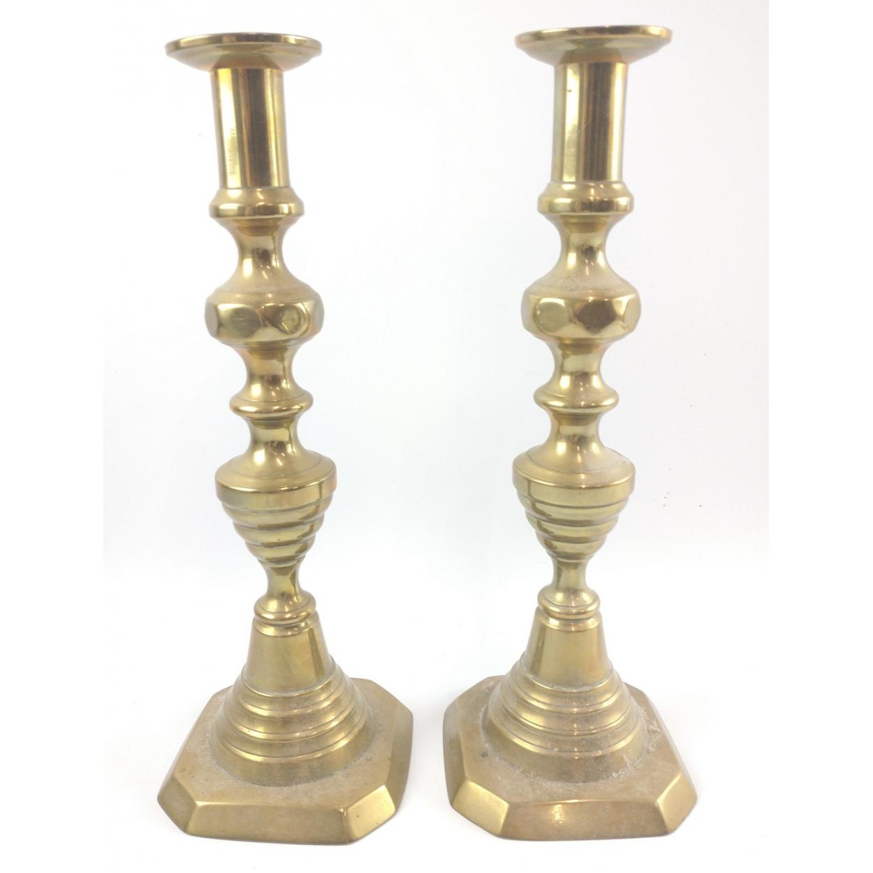 Two antique brass early Victorian pair of candlesticks - height 30cm