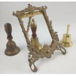 Collection of brass to include 3 bells and photo frame (overall height: 23cm, fits photograph approx 15cm tall)