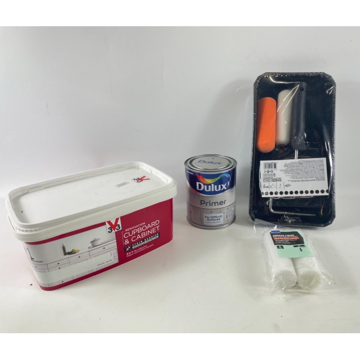 Top quality NEW SEALED Kitchen/cupboard door renovation package to paint up to 24 sq.m (up to 20 cabinet doors with 2 coats). Includes a large 2L tub of V33 white satin kitchen cupboard restoration paint (no undercoat required), top quality Dulux difficult surfaces Primer & a good fine gloss/satin roller set with extra pack of finishing rollers for smooth top coat. Cost over £60 at B&Q