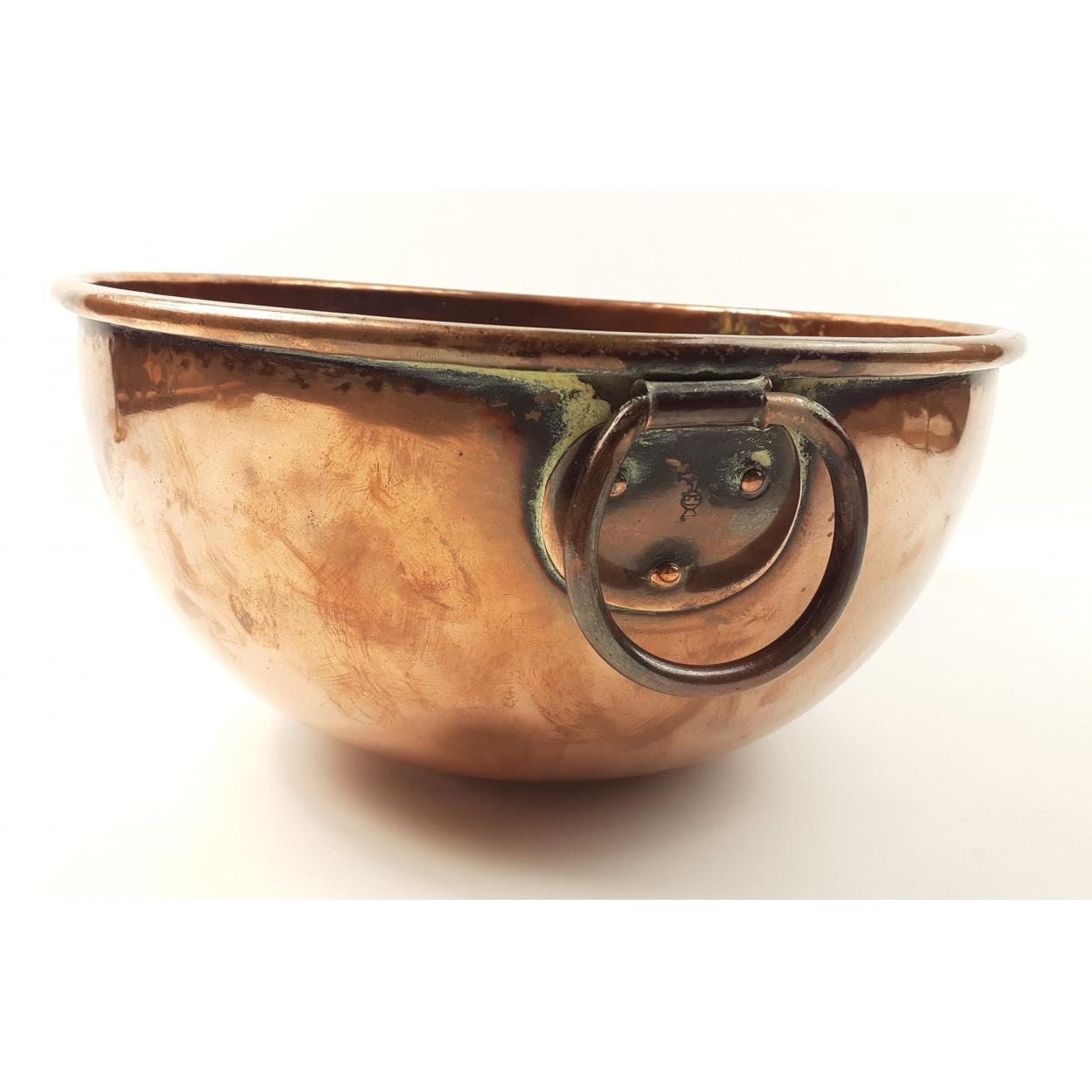 A large c1850s single handed SOLID COPPER bowl weighing approx 1.8kg, stamped with a crest and a letter 'H', 31cm dia - from part of a large kitchen set from a Scottish stately home