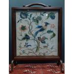 A FINE HANDMADE mahogany fire screen with beautifully executed embroidered bird of paradise and snake, 72cm tall approx