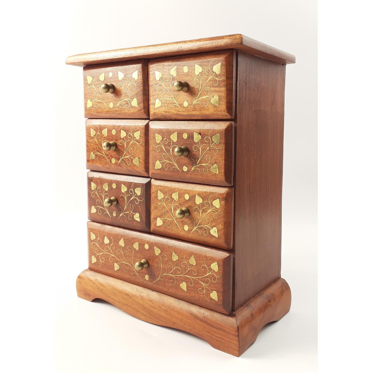 A seven drawer teak knick-knack chest with brass inlay, beautifully constructed. H28xD12xW23cm approx
