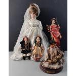 Collection of porcelain dolls to include Regency Fine Art "First Born", rotation Japanese style doll possibly a music box (A/F), 2 smaller dolls and a Leonardo Collection doll on stand in a wedding dress