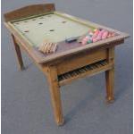 A RARE superb pub skittles table by ATLAS 187x94x87cm approx with baize and skittles. Table does have wear but would be a superb renovation project to bring it back to its former glory. Comes with replacement baize and scoreboard header