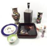 A mixed lot to include a lacquered tray, Oriental collectors plate, Oriental figurines, Royal Worcester small tureen, 2 attractive tall floral vases, leather bound table lamp