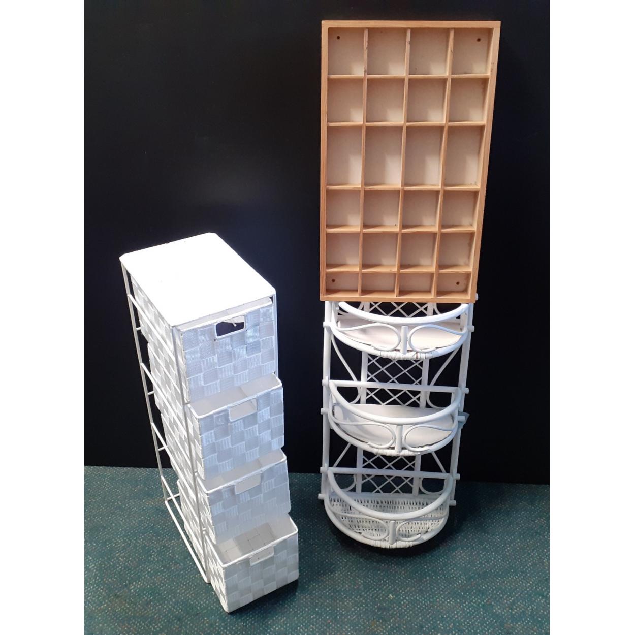 A mixed lot comprising of a wooden display tray for collectables, 3 shelf white wall hanging, 4 drawer white storage unit.