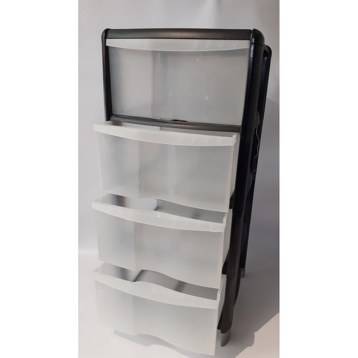 A four drawer stacking plastic chest in good order with wheels to rear. Stands 84cm high approx