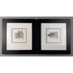 Two rather attractive and well-executed framed musical notation prints of a harmonica and the other of bagpipes, each 26x26cm approx