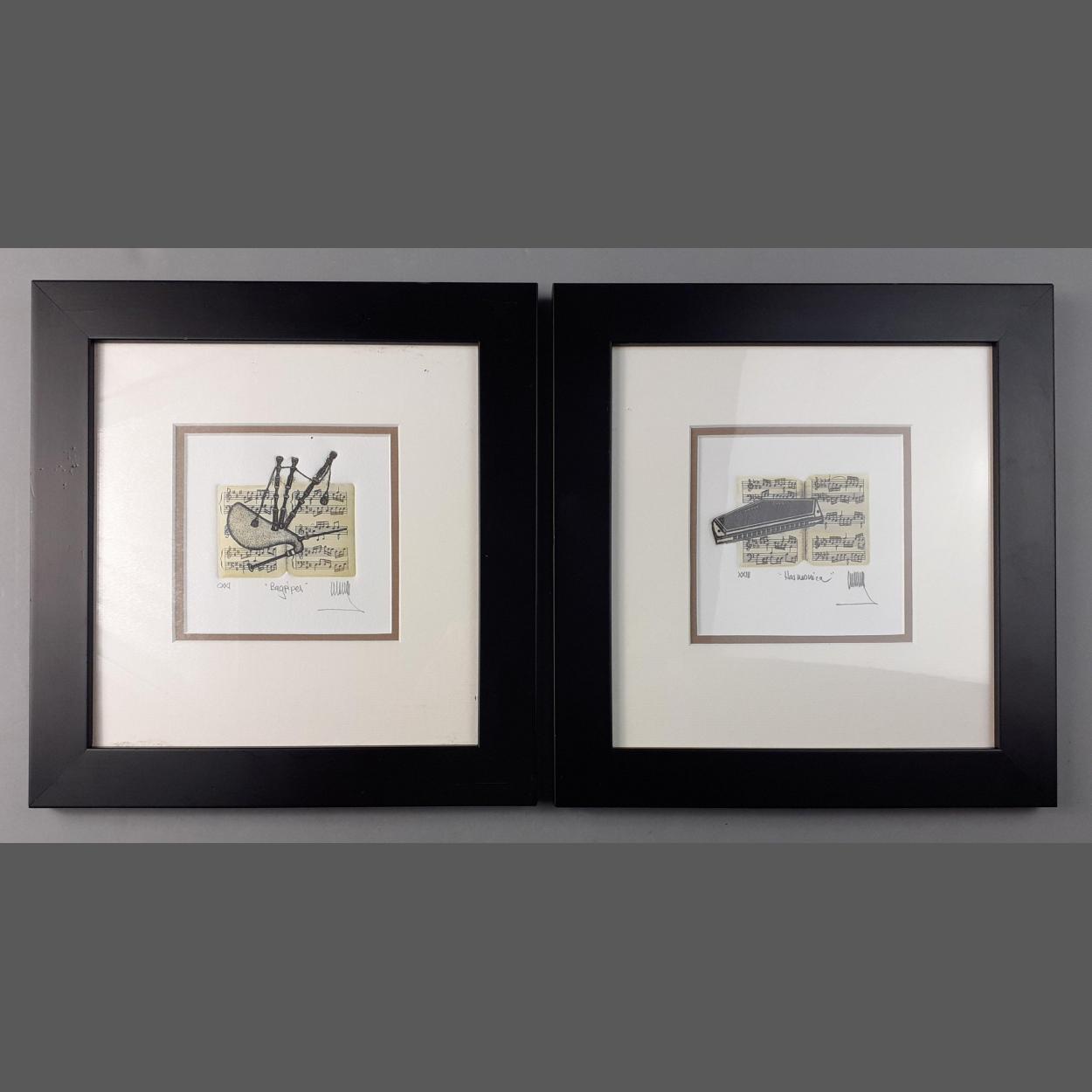 Two rather attractive and well-executed framed musical notation prints of a harmonica and the other of bagpipes, each 26x26cm approx
