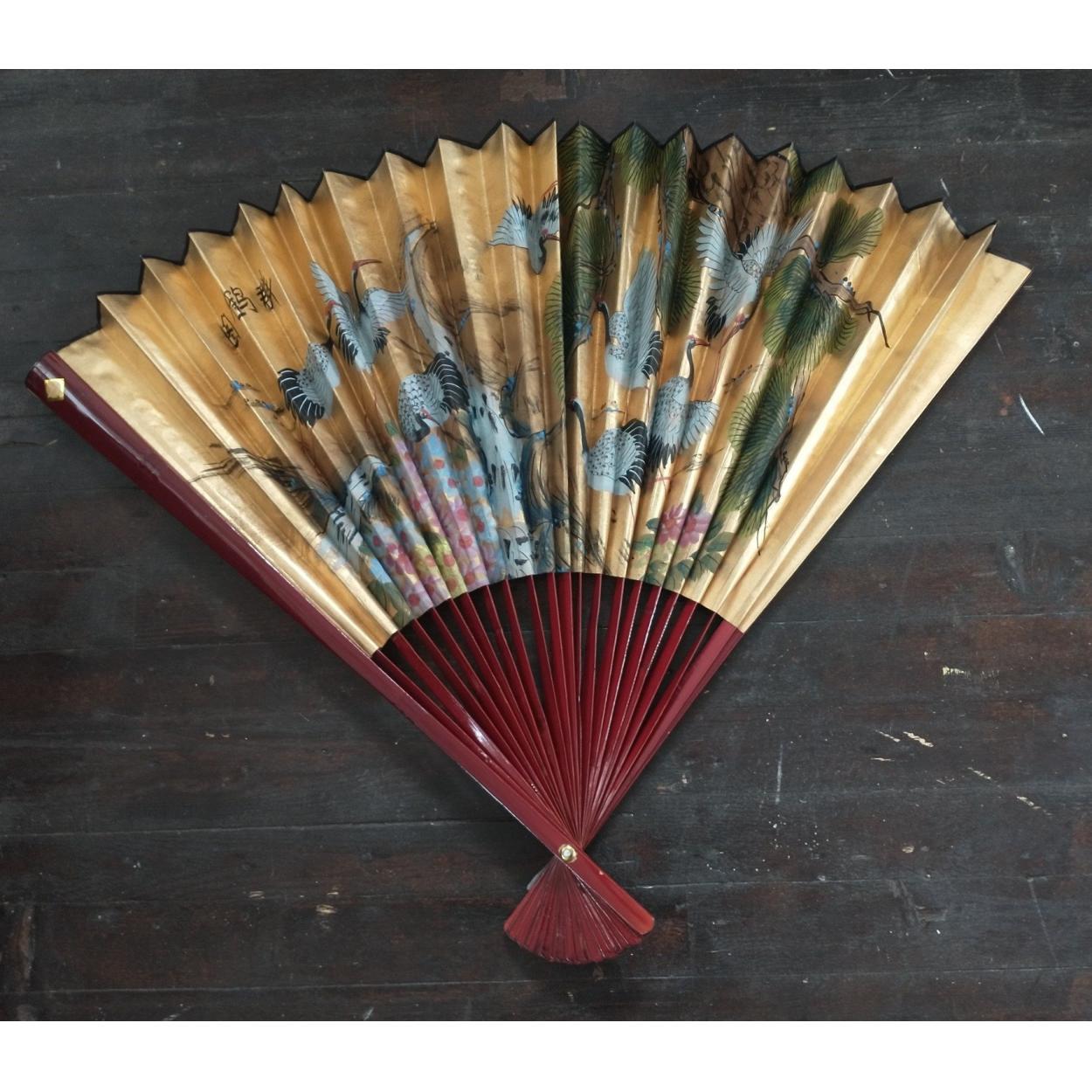 A very large Oriental wall fan decorated with cranes, measures 117cm fully extended
