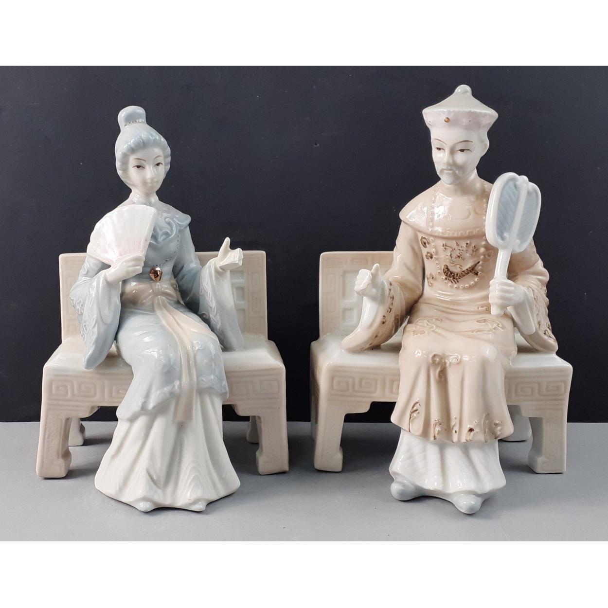 An Oriental seated lady and gentleman approx 18cm tall, lady's fingers broken on one hand