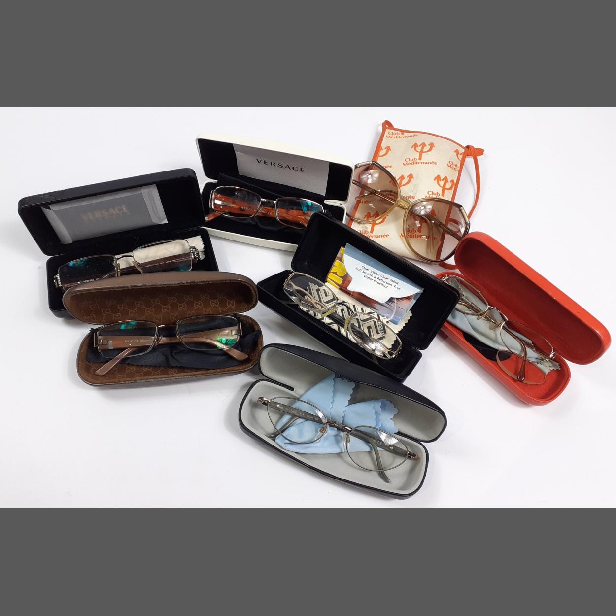 Seven pairs of prescription designer framed glasses in cases, to include 2 by Versace, also Gucci, Club Mediterranee, and Azzaro - some of these frames were over £600 each!!