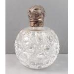Very attractive cut glass bottle with a beautiful detailed silver top. Hallmarks indistinct. Standing approx 10cm tall