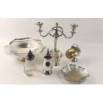 A silver plate lot to include 23cm dia footed tray, 2 branch candelabra, milk jug, salt with shovel, and an EP topped sifter and a boxed miniature Viner's wine cooler. Nice lot in good condition