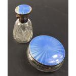 A silver collared cut glass dressing table perfume bottle and trinket dish (9cm dia approx), with blue enamelled tops, hallmarked for Birmingham 1920. There is damage to the perfume bottle top.