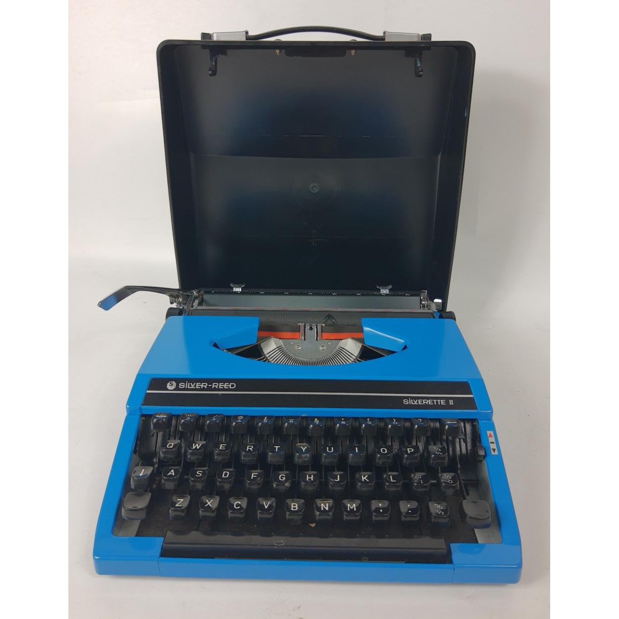 Vintage Silver-Reed Silverette II portable typewriter in case. Lovely clean condition with a very attractive blue finish. 32 x 29cm approx