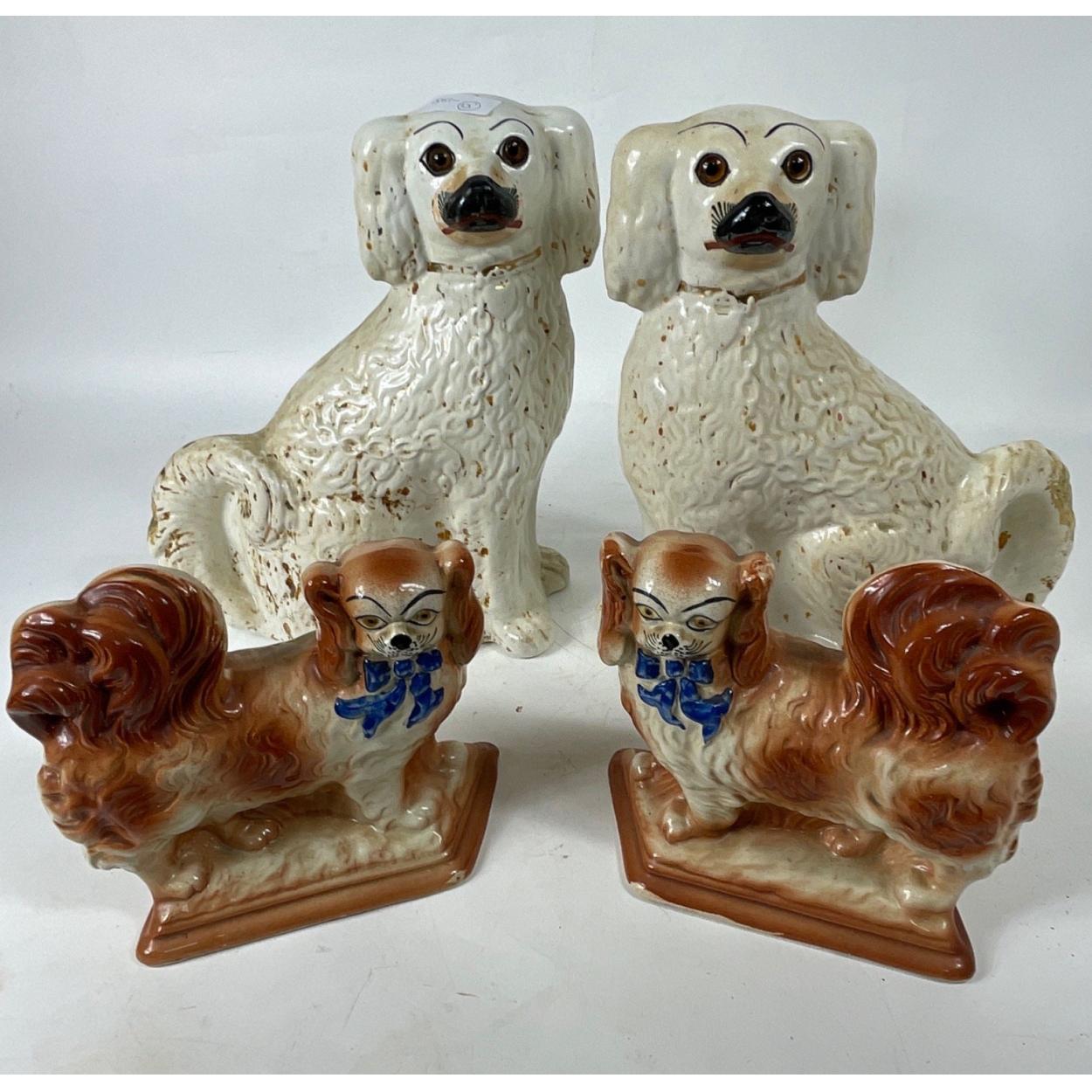 A pair of Victorian STAFFORDSHIRE mantelpiece Pekingese Wally Dugs each 20x20cm approx, and a pair of vintage flat-backed Wally dugs with glass eyes each standing 33cm high