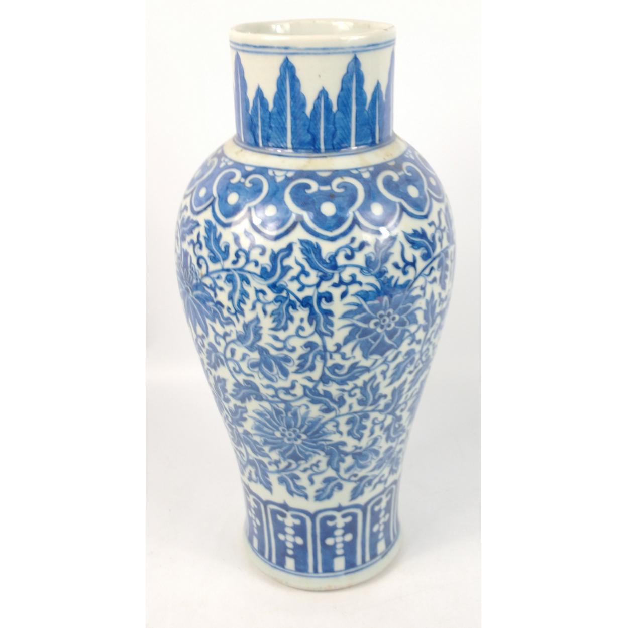 A vintage blue and white Chinese vase 40cm high with a scrolling floral pattern, no marks to the base, The vase is in good condition.  There is a minor mark / chip to the rim as noted in the photos and some discolouration around the neck area but it looks like this will clean off.