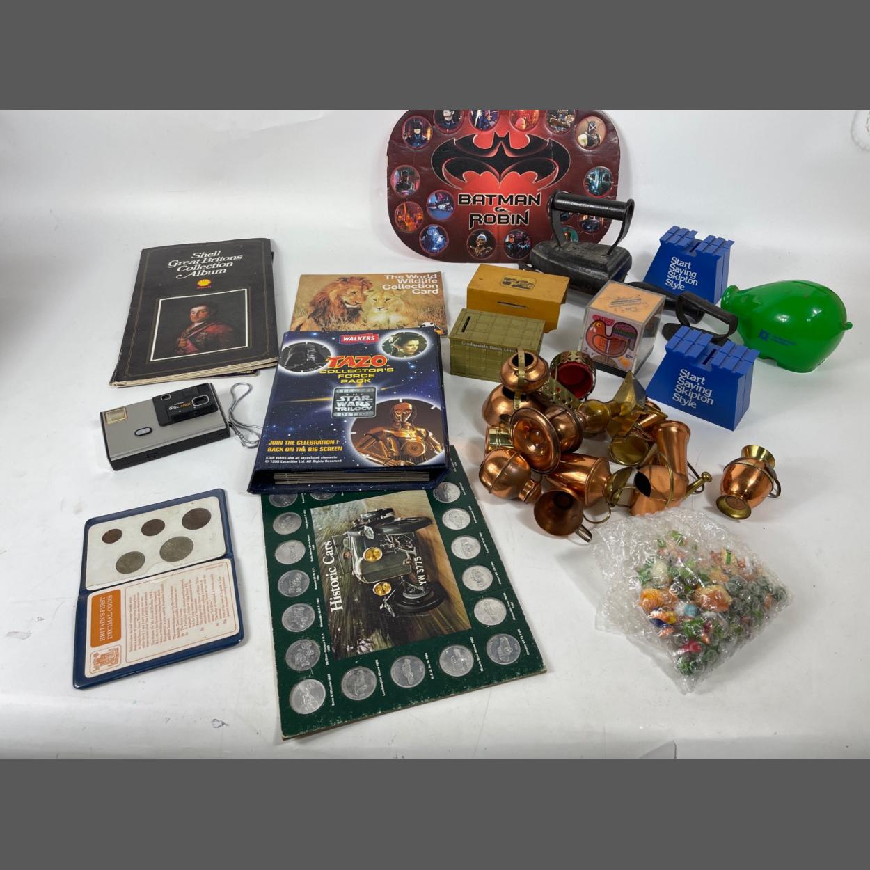 A mixed lot including vintage savings banks from various banks - Clydesdale, RBS, Skipton plus one MAUCHLINE savings bank- collectable coin collection from SHELL - Man in Flight, World Wildlife collection, Historic Cars, Great Britons, plus TAZO, and Batman and Robin, a full set of Britain's first decimal coins, 2 flat irons with cast iron trivet, a KODAK disc 4000 camera, a collection of FERRERO animals and a further collection of miniature copper utensils