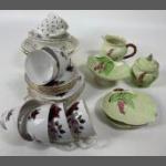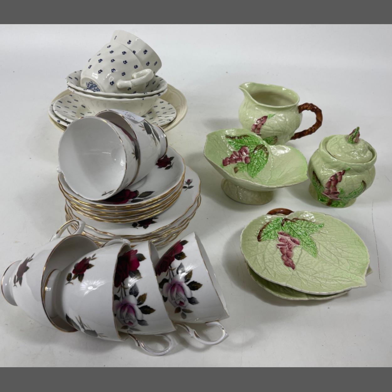 A mixed box of china to include 5 pieces of CARLTON WARE cabbage ware, a part COLCLOUGH tea service to include 6 cups, saucers and side plates, breakfast for two with a ROYAL TUDOR Petit Fleur set comprising 2 cups, bowls and side plates etc